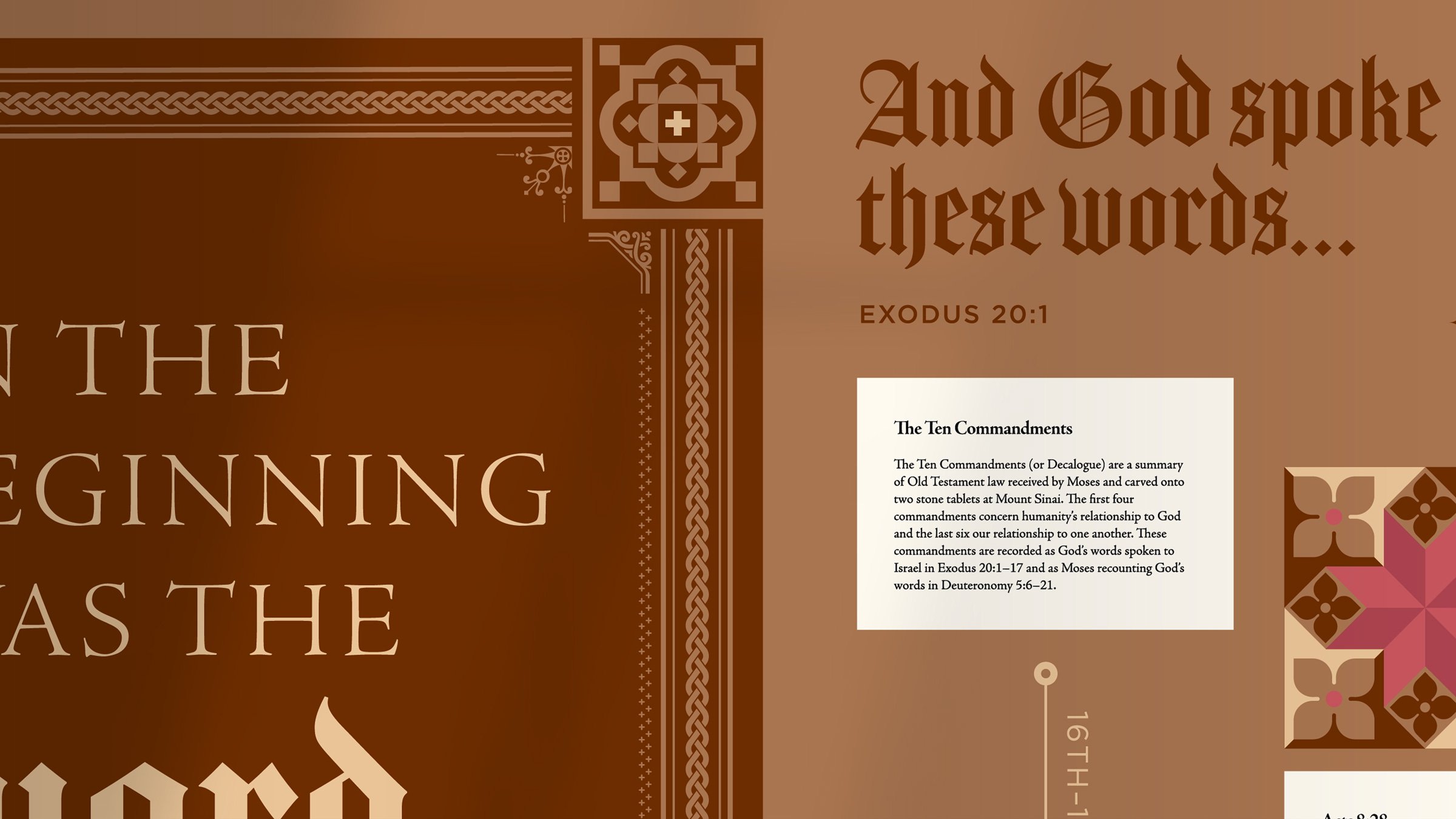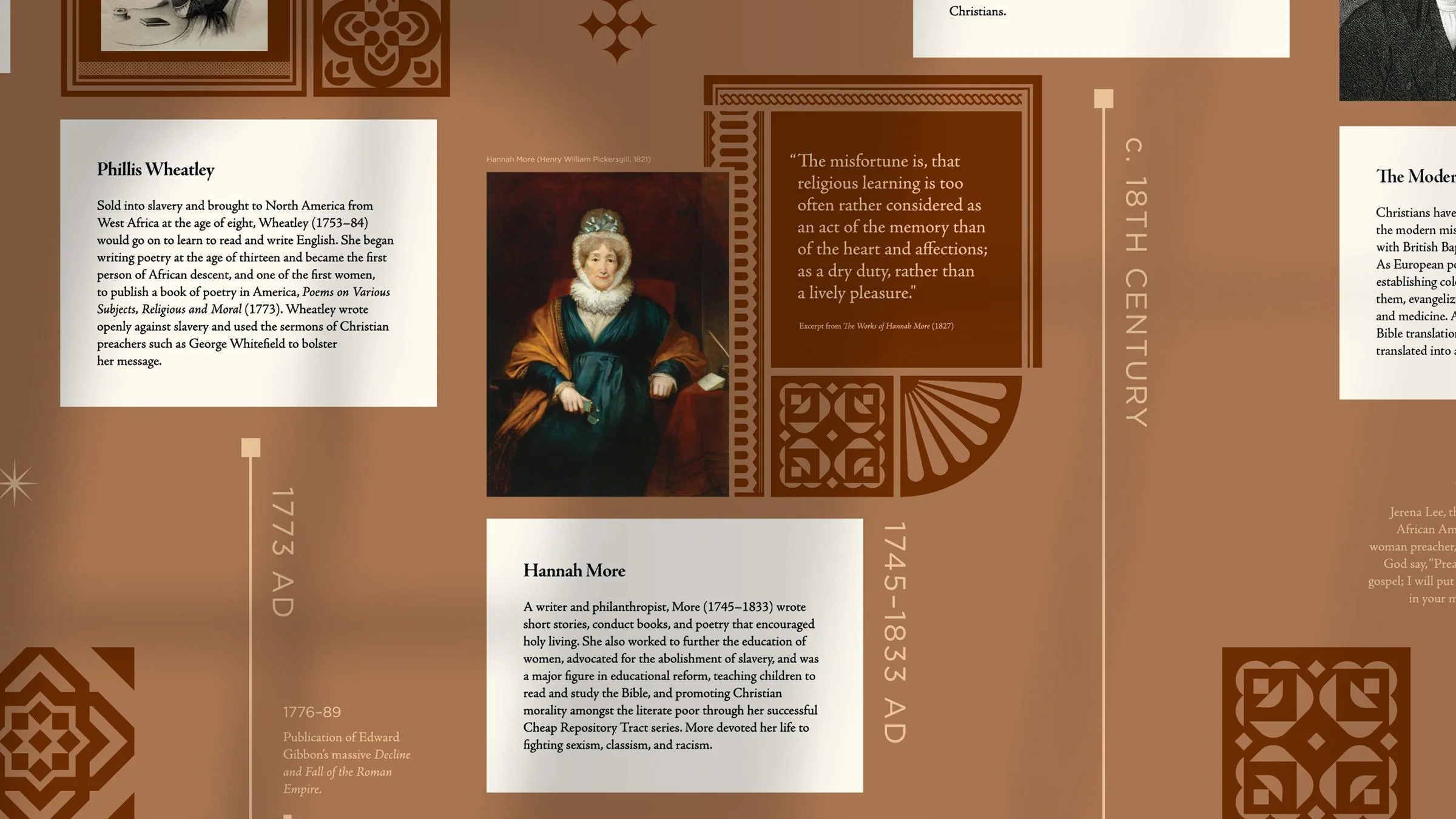 “It was a joy to work with Steph on this project, which she conceived, designed, and executed brilliantly. The timeline was a complex project: spanning 2000 years of history and a global movement, it employed text and image to illuminate a single theme. My team and I thoroughly enjoyed collaborating with her, as we proposed ideas and text, and she weaved it all together into a compelling, evocative, and striking portrayal of the word and witness of God across generations and continents. I am beyond thrilled with the result, and was so pleased with Steph’s work that I quickly engaged her work on another permanent display. Steph is inspired, skilled, professional, and a delightful person to work with on any project.”
